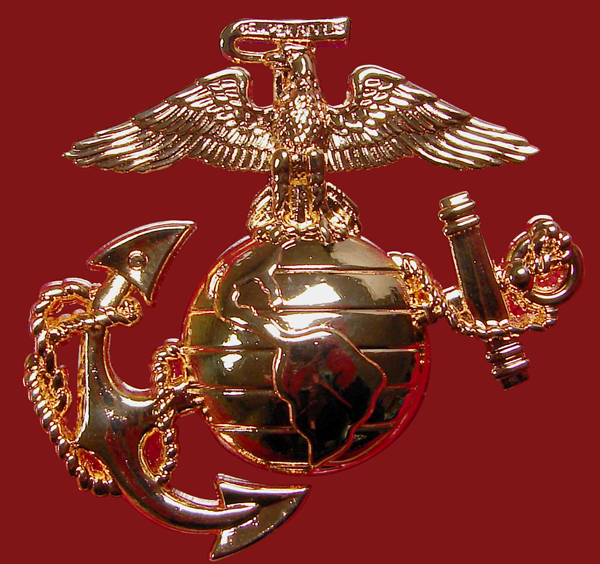 features the Marine EGA (Eagle, Globe, Anchor) logo in Gold 3D and two gold plates with black printing (up to three lines of personalization on each plate). |